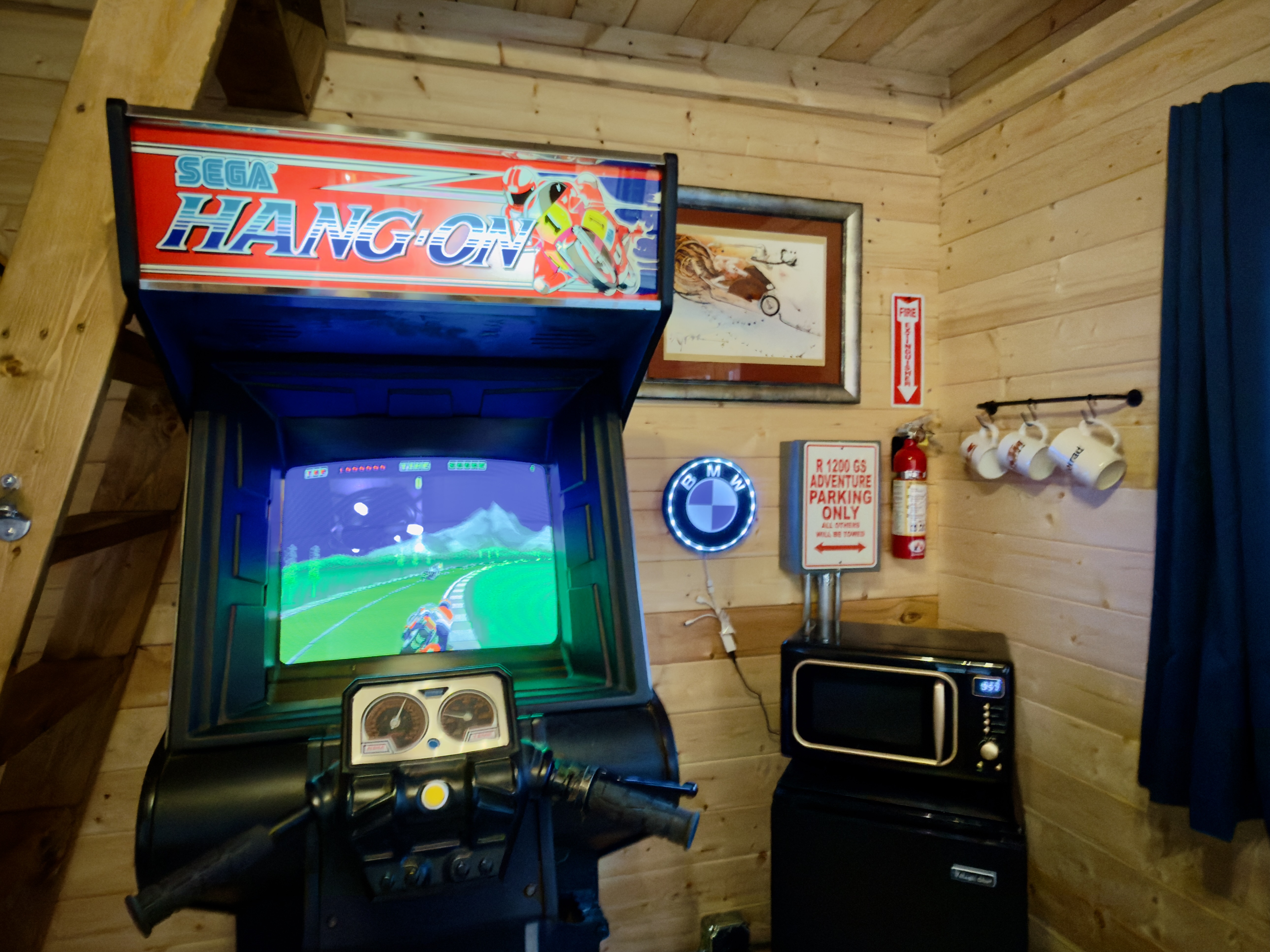 Braap! You've been riding the trails hard all day, picking up mud and perhaps even your bike a time or ten. End your day practicing your skills on this cabin's vintage Sega Hang On arcade game. Kick back with a cold cider on your deck. Relax those tired limbs in our wood-fired sauna, and get rested up for another day of moto antics. The ADV cabin features two twin beds and a heap of riding inspiration. Even if you're not fresh off the Backcountry Discovery Route, you'll enjoy this gnarly oasis.