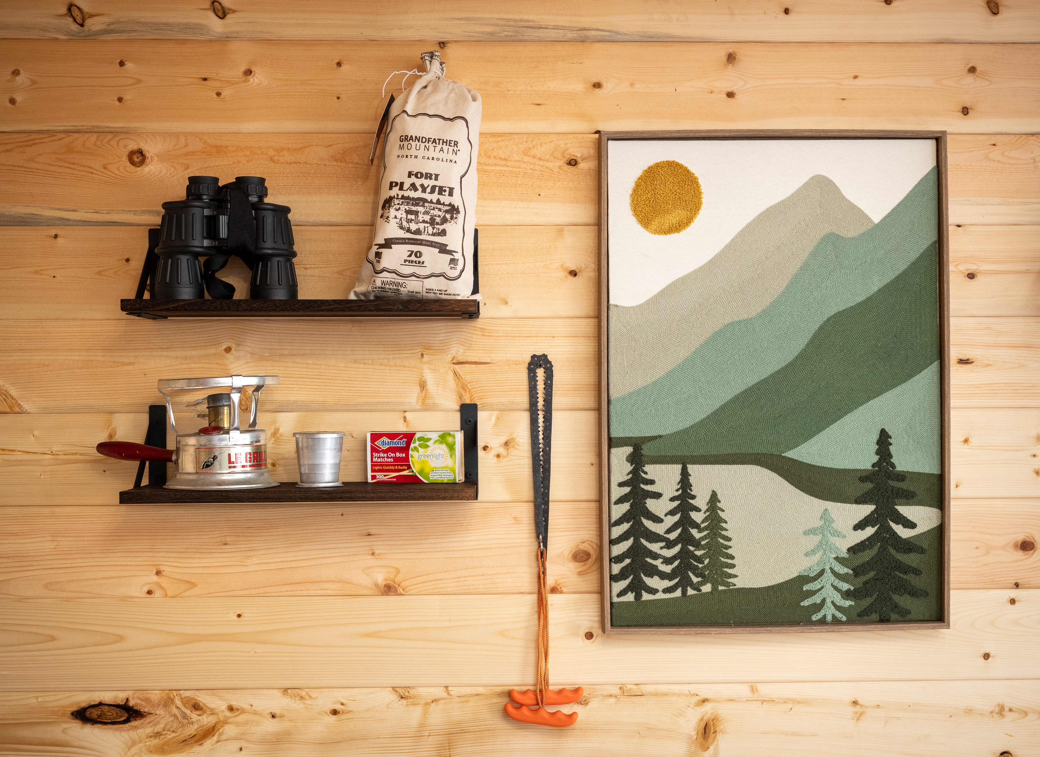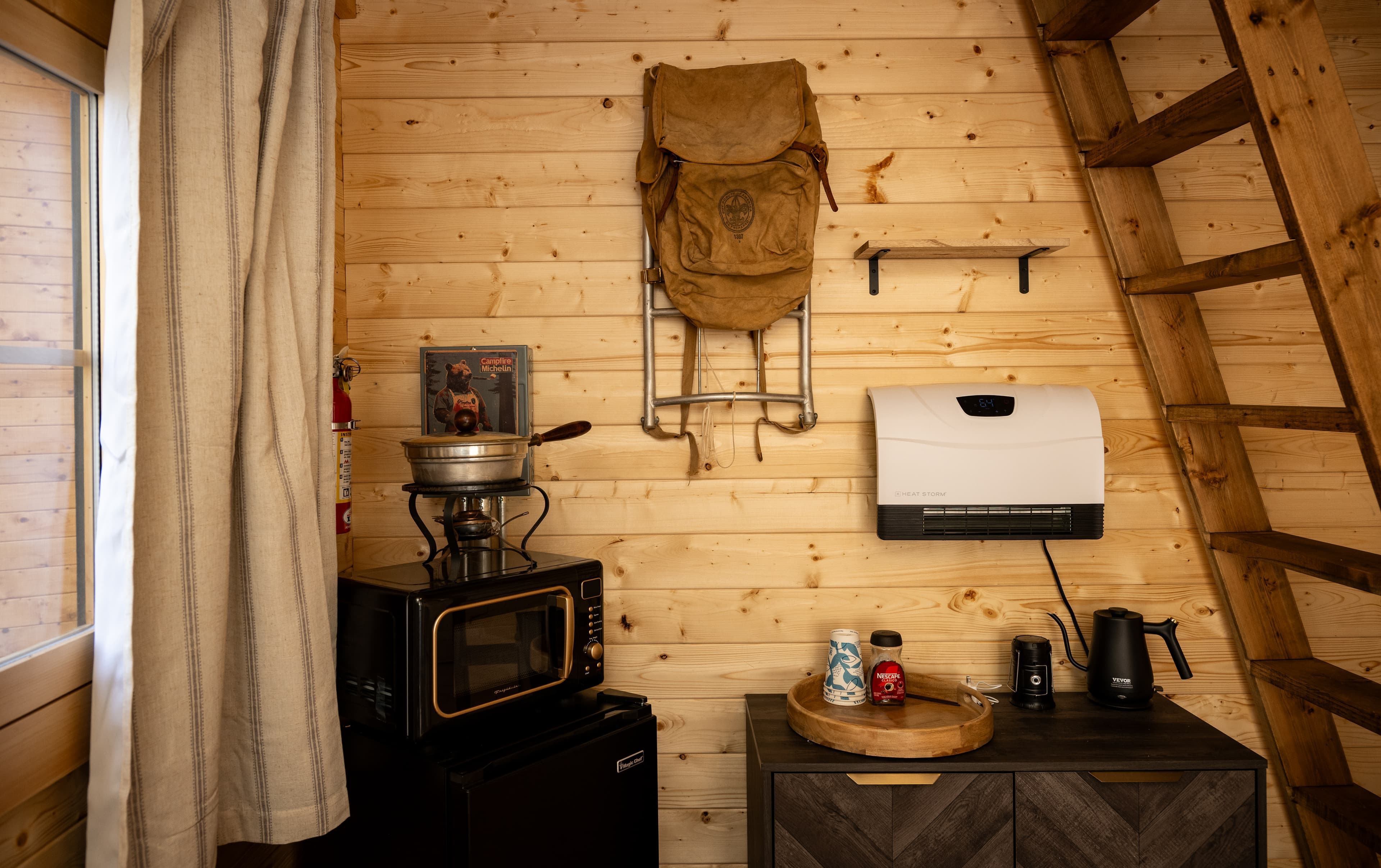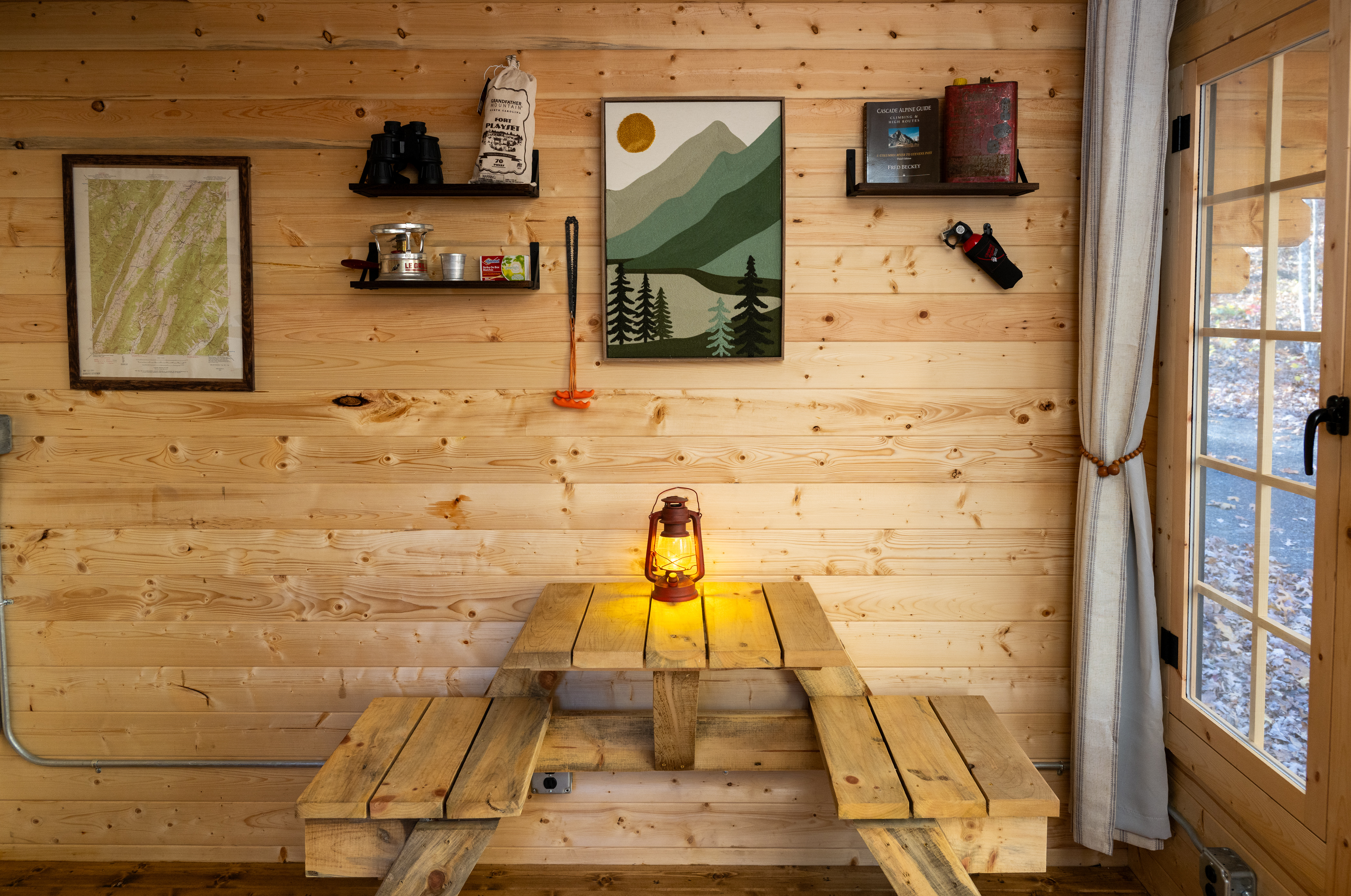 The ultimate basecamp for summit seekers and rock huggers, our hiking cabin is perfect after a long day of questionable choices. Walls with vintage backpacks that take you back to your youth, a fingerboard to keep your hands nimble for that next V-6 project. Throw down your gear and kick off your hiking boots in the large loft featuring a queen bed. Plan tomorrow's hiking route out on the deck, or hone your skills on the outdoor climbing wall on the back side of the cabin. Seneca Rocks and its 450 climbing routes are just a dirtbag-van ride away. Blisters be damned...chalk on friends.