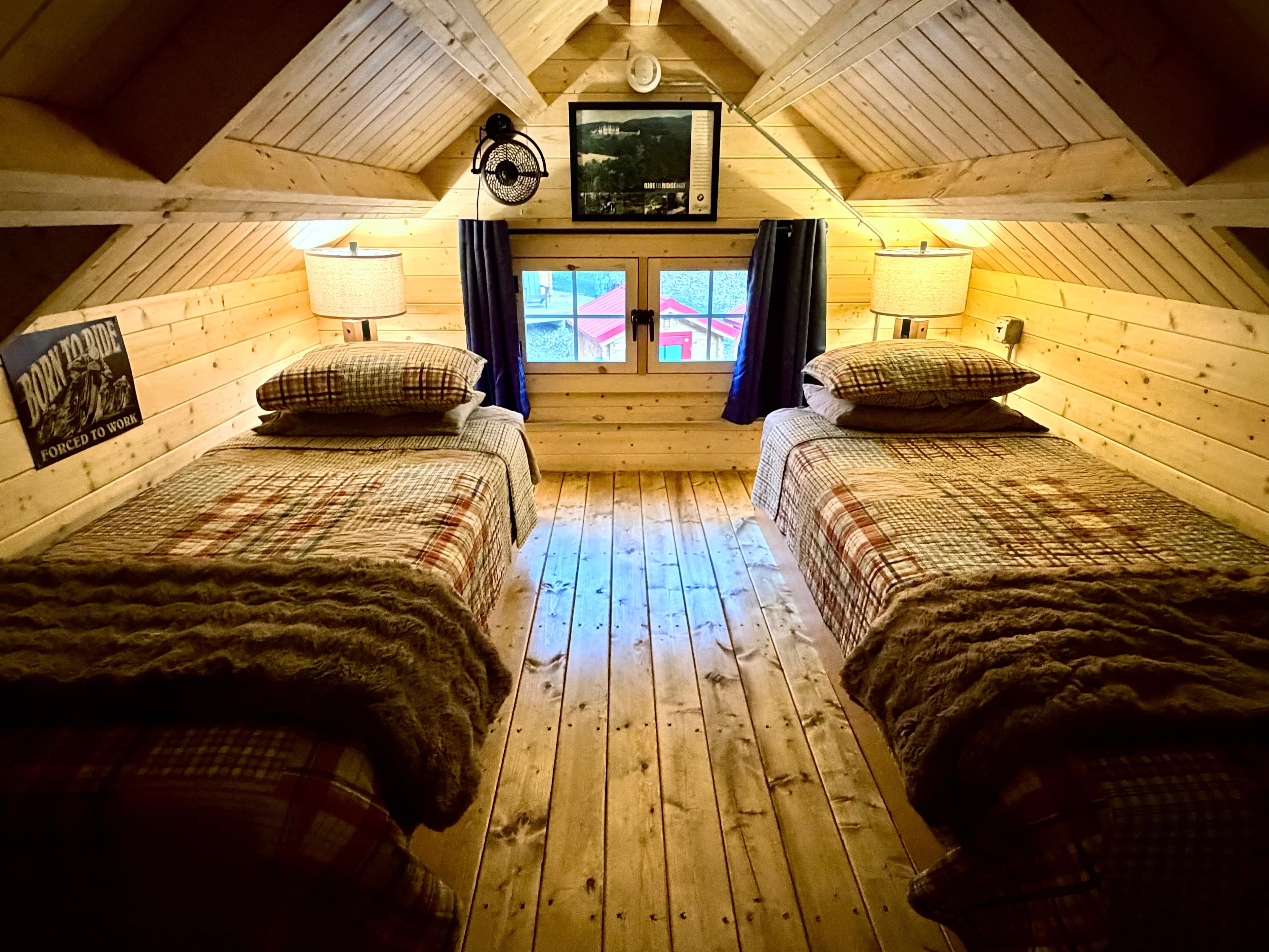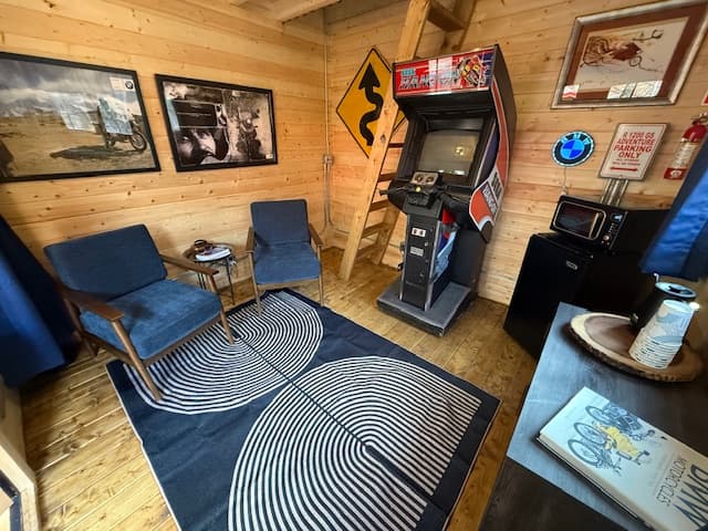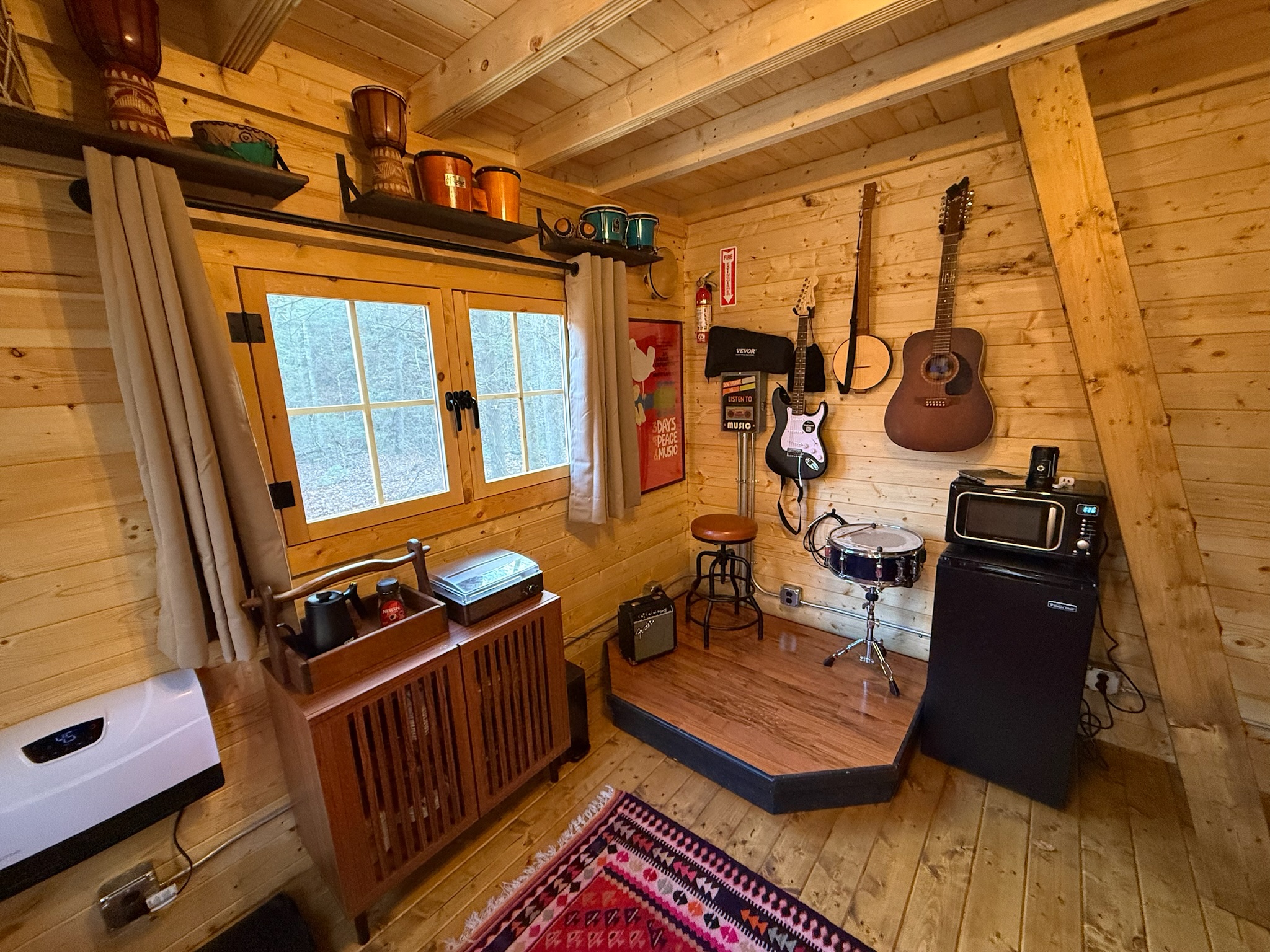 There's treble in paradise inside this music-themed cabin, where the only thing louder than the décor is your cousin trying to play Wonderwall on the kazoo for the 14th time. Whether you're a shower singer, an air guitarist, or a seasoned virtuoso, this place is your personal studio full of instruments to inspire (or make you realize you need to keep your day job). Inside, you'll find an electric and 12-string acoustic guitar, bongos, a small xylophone, and even a tiny stage to play for your audience of none. For those whose musical talents make a squeaky door seem like a symphony, there is a small record player and a wall of records to choose from. Upstairs is a queen bed and plenty of space for you and your groupies to kick back after a long day of being a rock star.