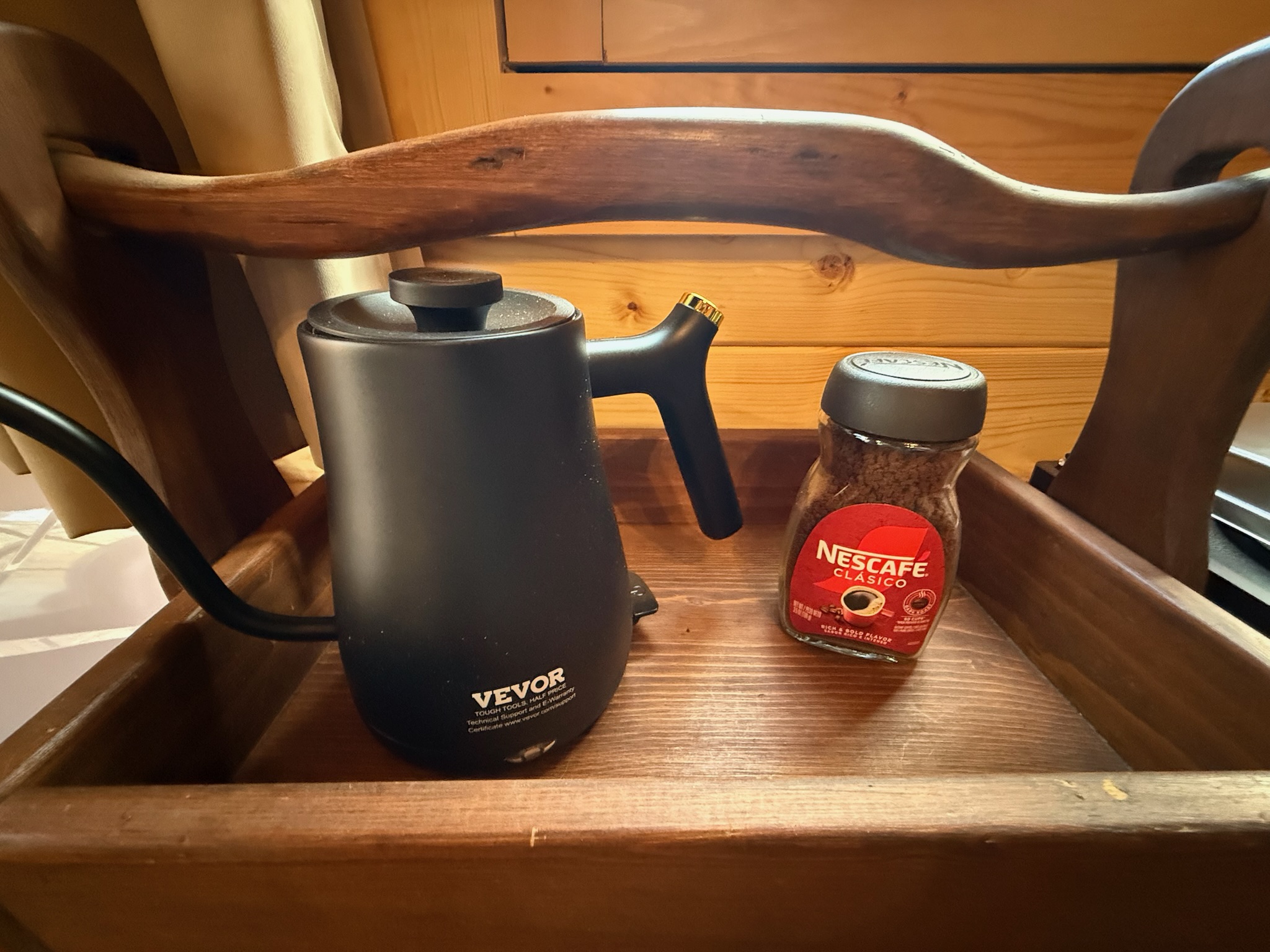Cabin is well appointed with a microwave, mini fridge, electric tea kettle, and instant coffee and tea.