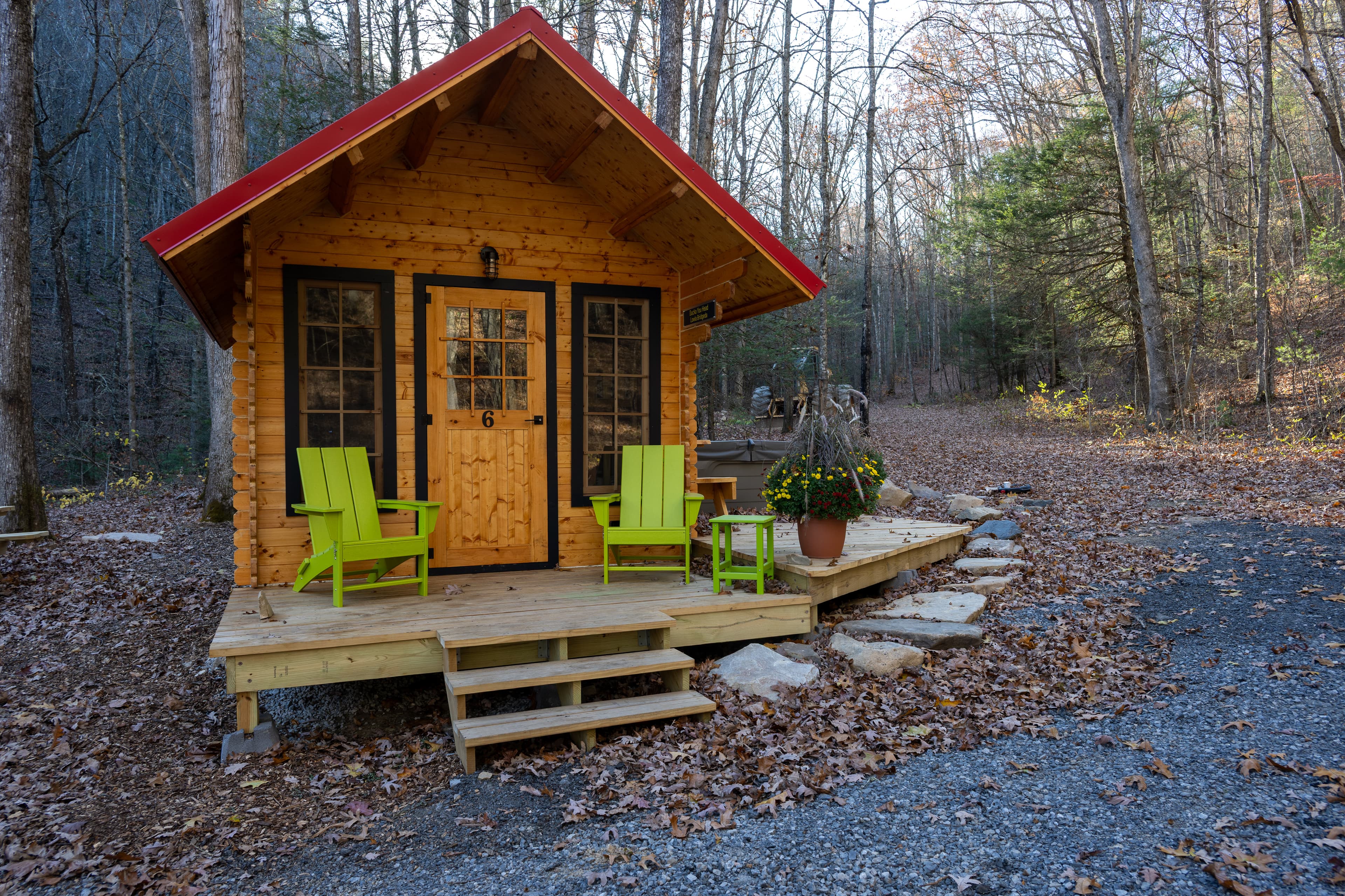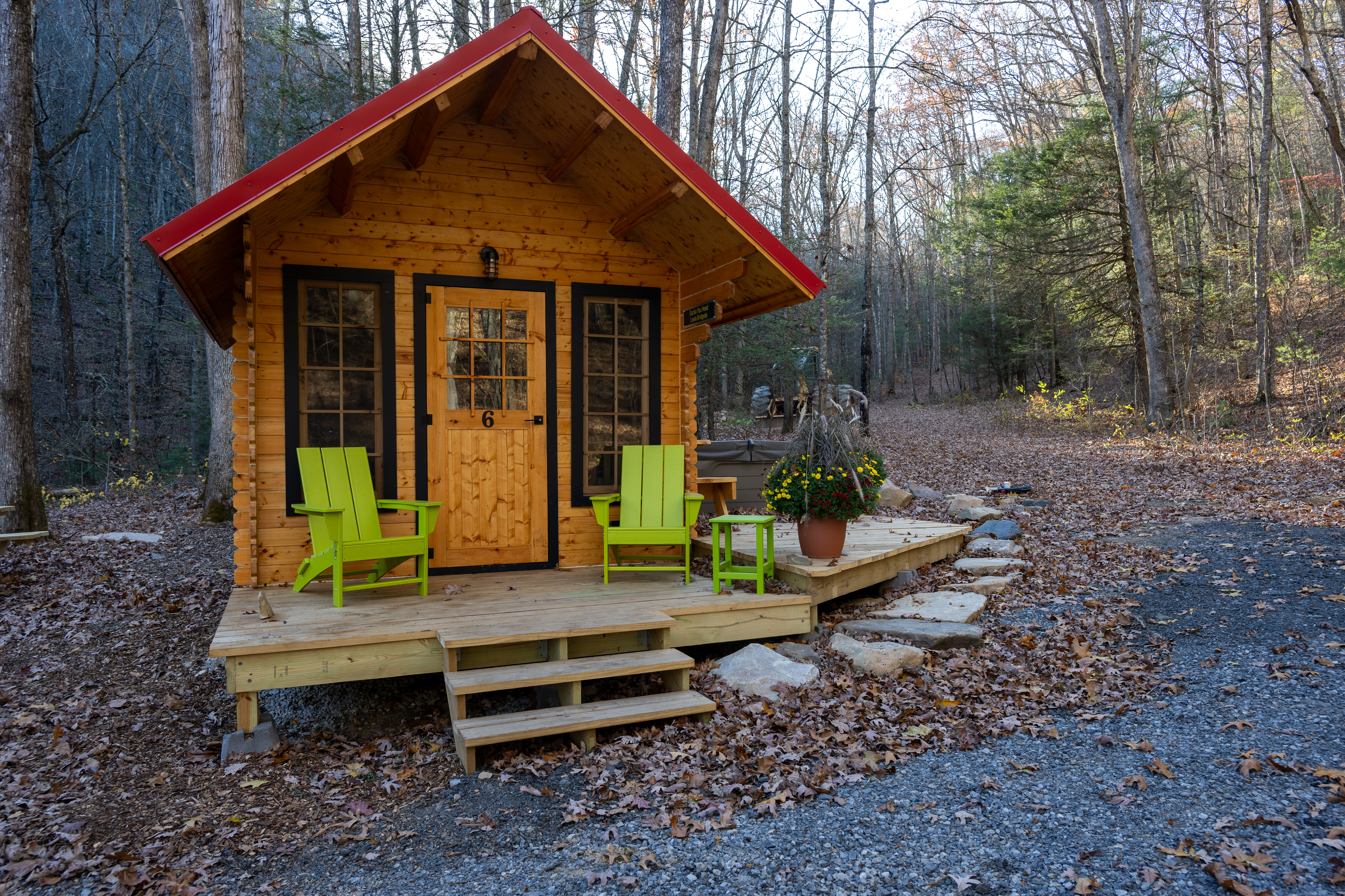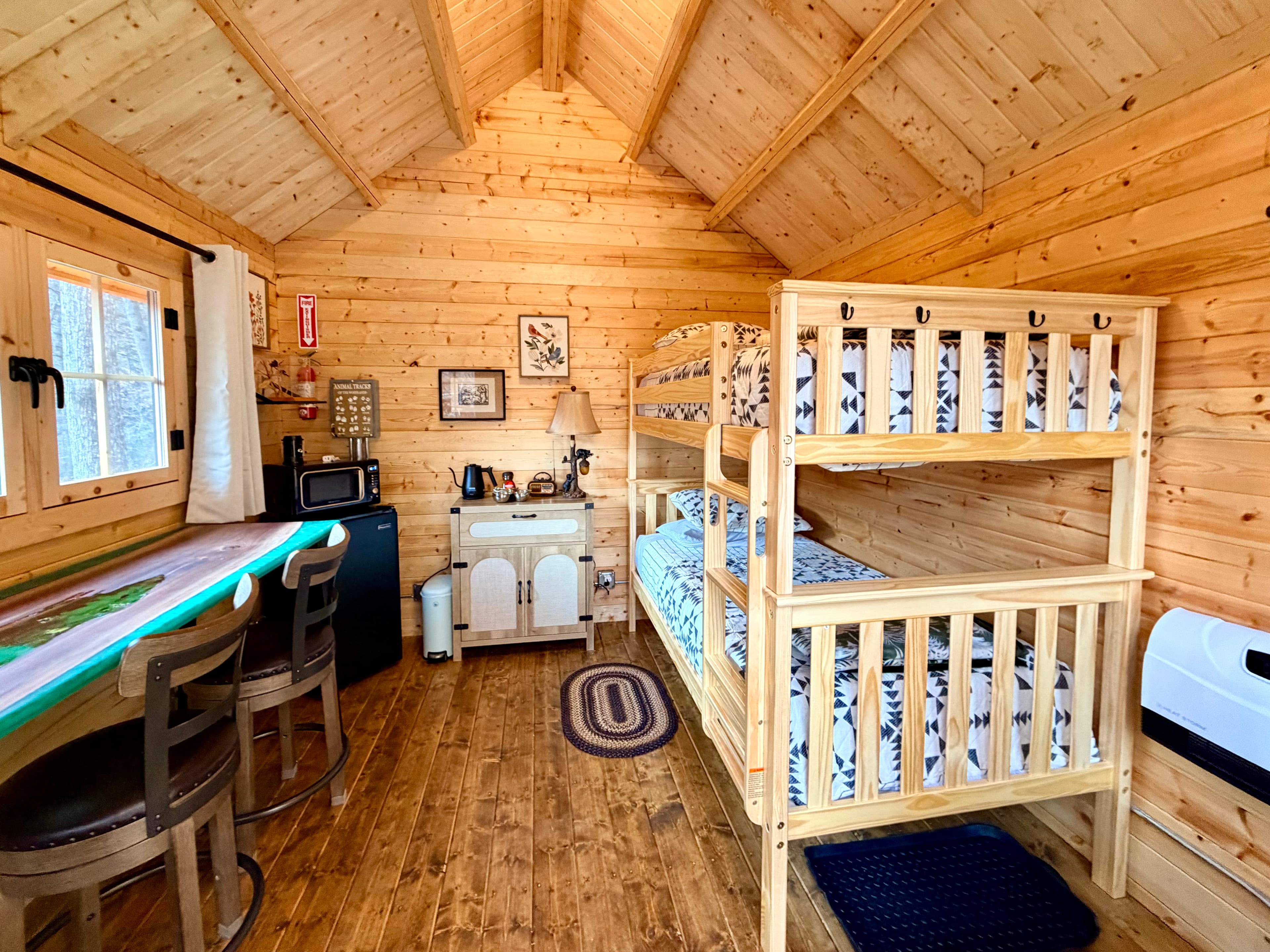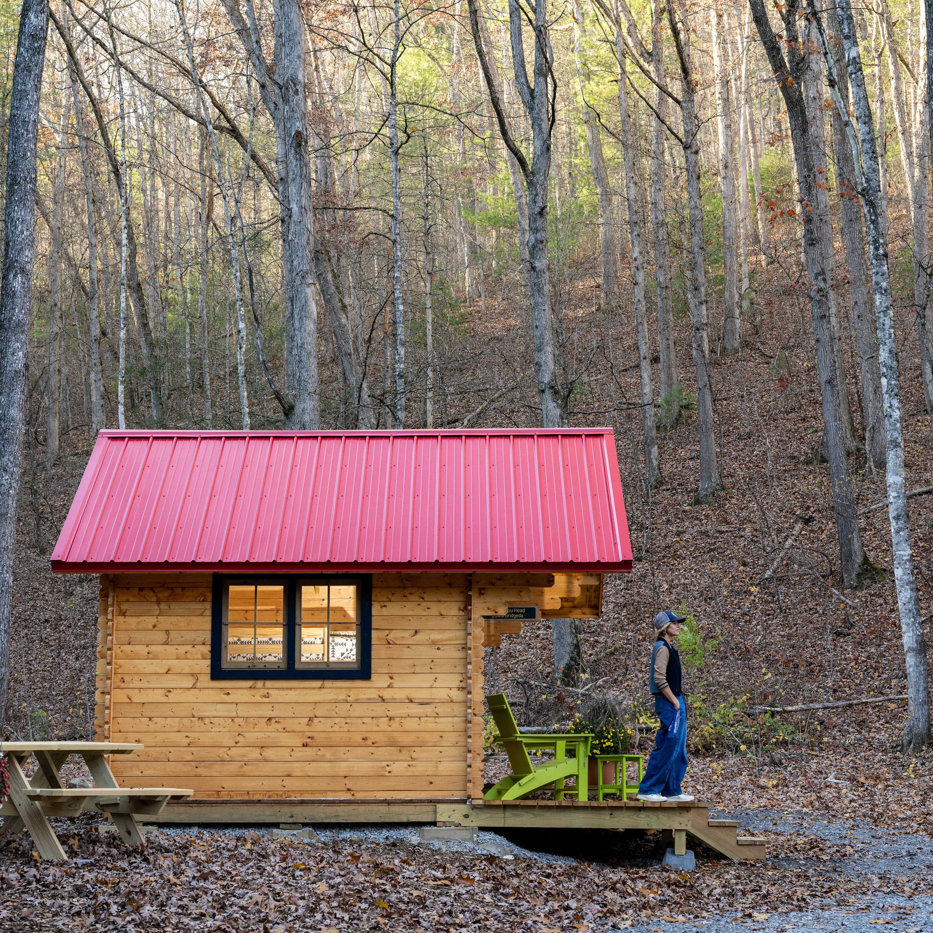 Close to our mile-long creek and far from the urban struggle, this charming single-story cabin is perfectly suited for long, lazy days in a hammock. The squirrel drama is strong, and we cannot guarantee a mildly judgmental deer won't stare through the window, but amongst it all are hiking trails and the sound of birds flitting about. This single-story hideaway features a twin-over-twin bunk bed and cozy décor.
