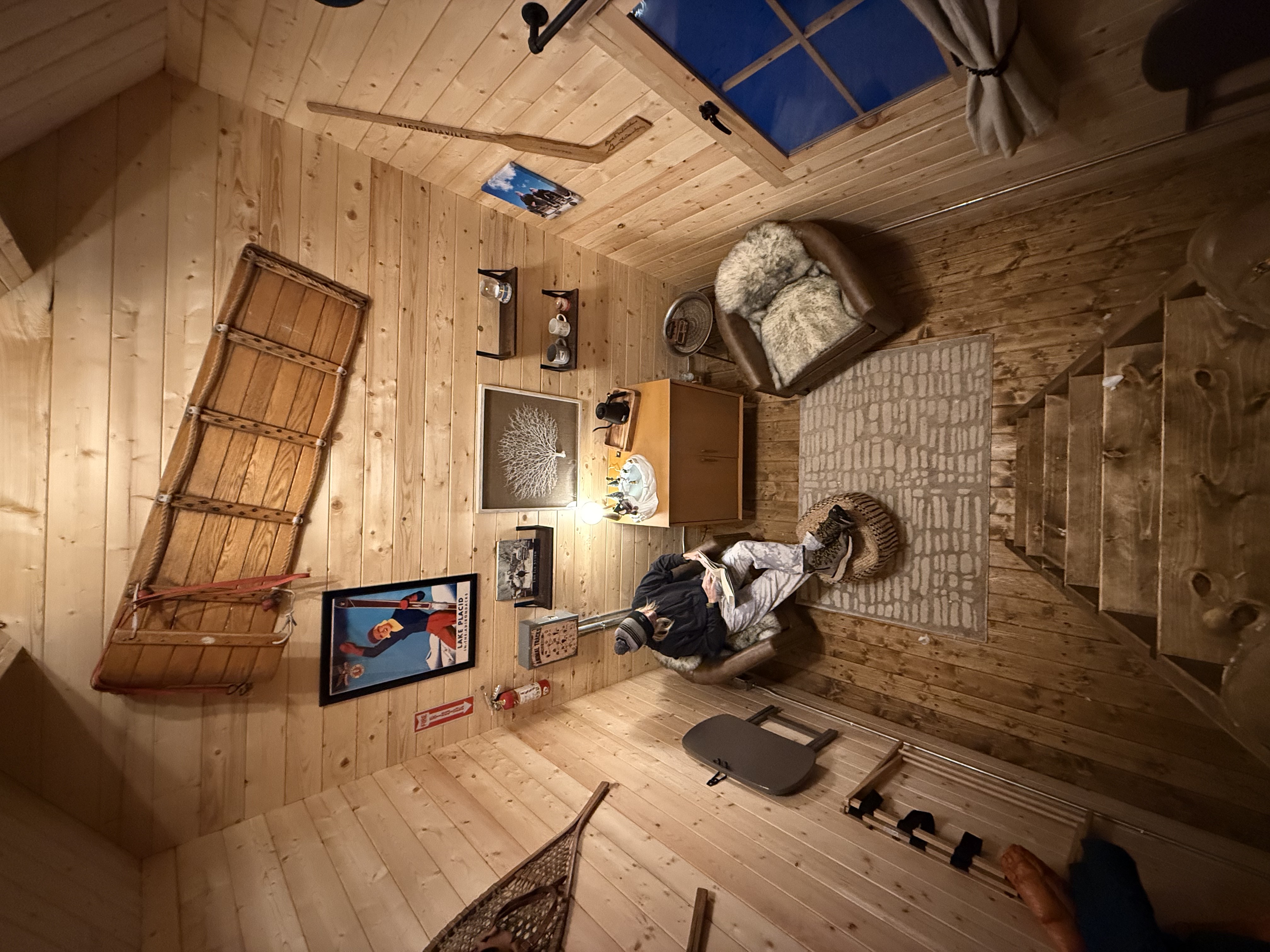 Sidle up with a cup of hot cocoa with too many marshmallows (once you're done debating whether there is actually such a thing as "too many" marshmallows). A cozy electric woodstove with the most realistic flames technology can conjure up, a braided rug, lanterns, games...why, you'll be kickin' like you're straight outta a camp in the mountains of Vermont. No matter the time of year, this snuggle shack has you feeling like winter is the best season. The cozy half loft has two 6' long twin beds, beckoning you into a burrito of warmth and laziness. So pretend your car got buried in the snow and you forgot a shovel. Darn, gotta' stay in today!