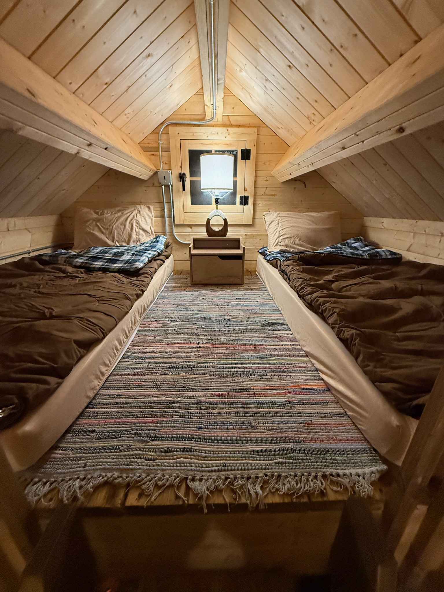 This cabin has a ladder to the small sleeping loft. If you are not comfortable climbing a ladder, please consider our flyfishing or nature cabin, both of which are single story. The loft in this cabin is 6 feet long, and the two twin mattresses are also 6' long. If you are taller than 6 feet, you may find another cabin more comfortable for sleeping. (the Winter cabin also has a 6' sleeping area, but all others are standard bed length).